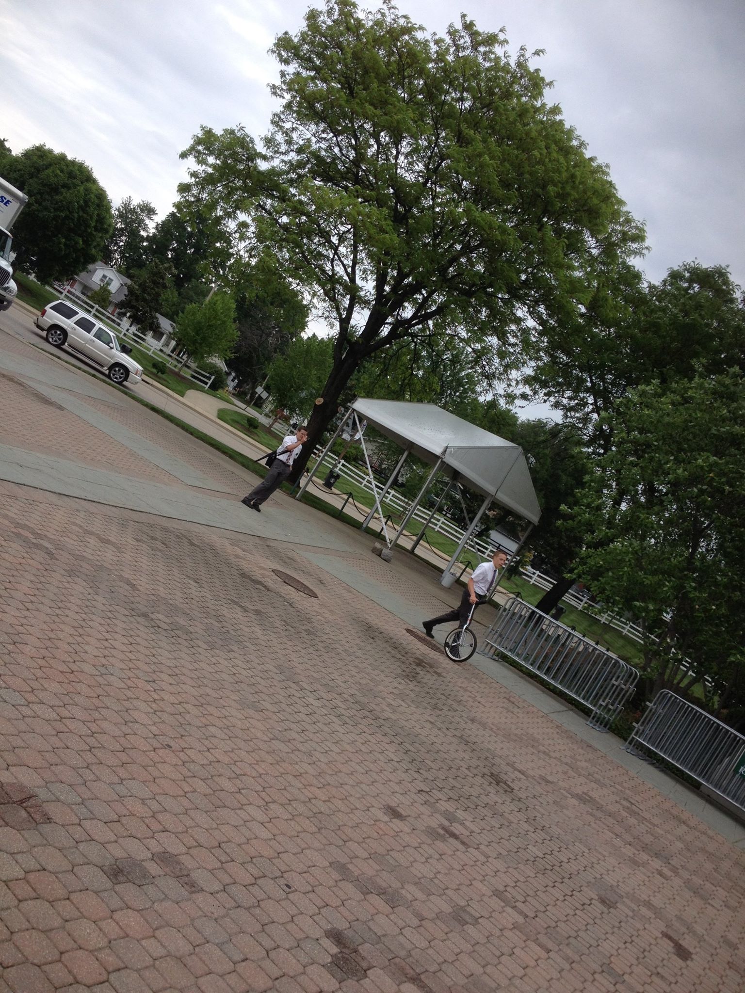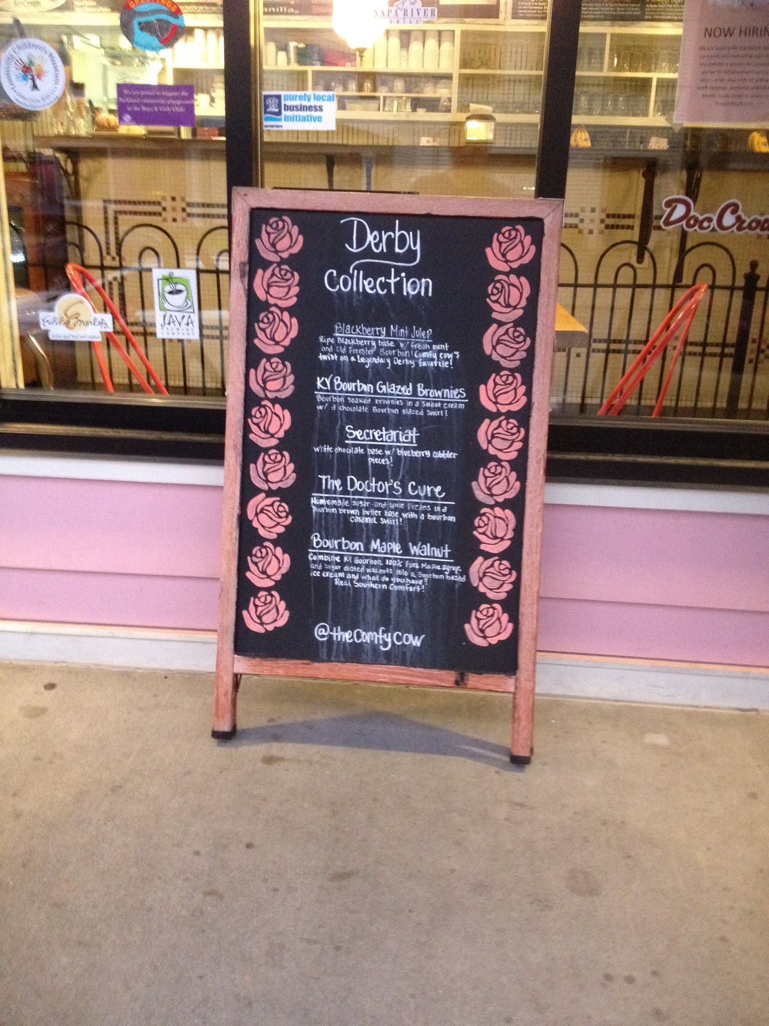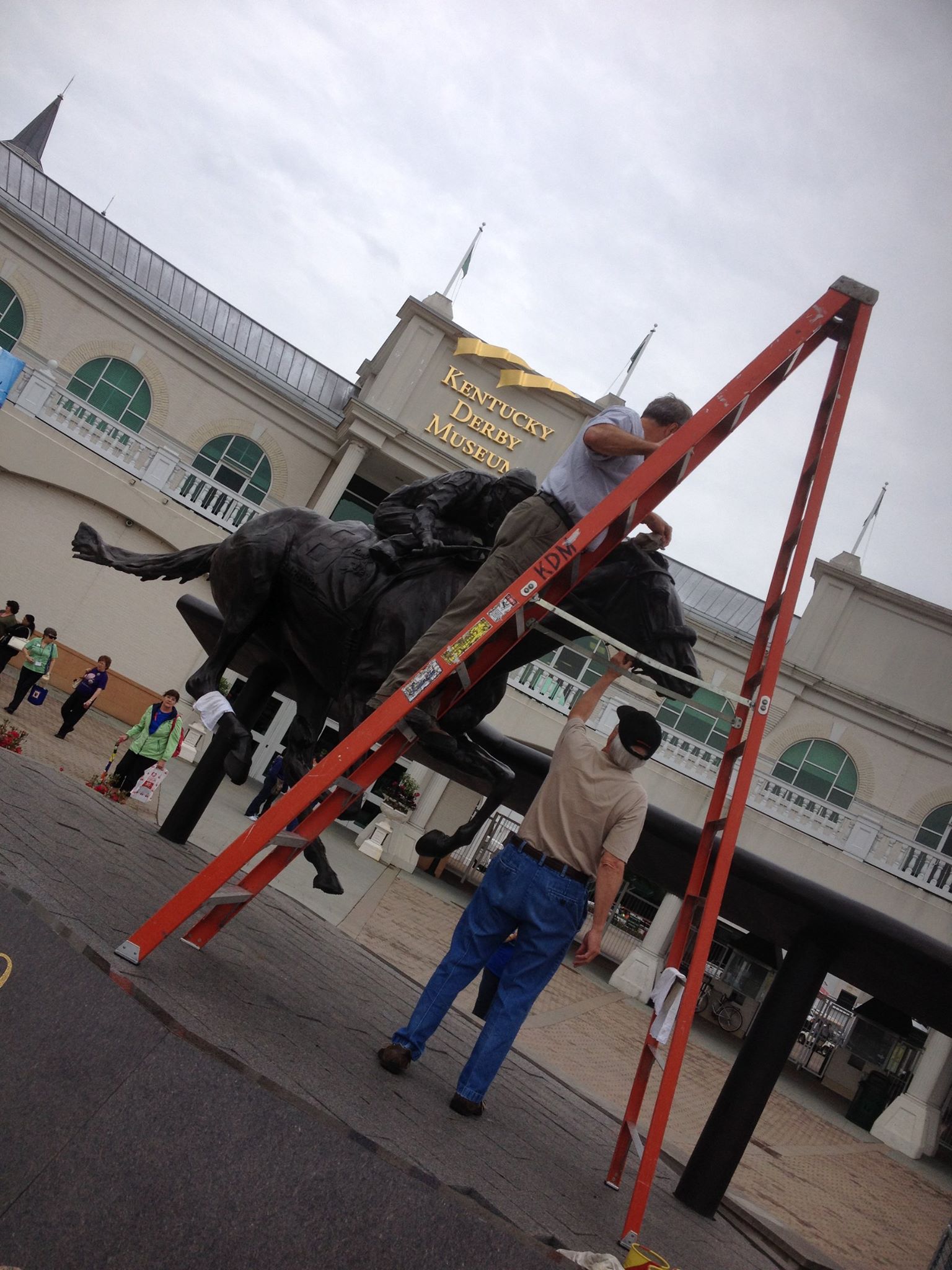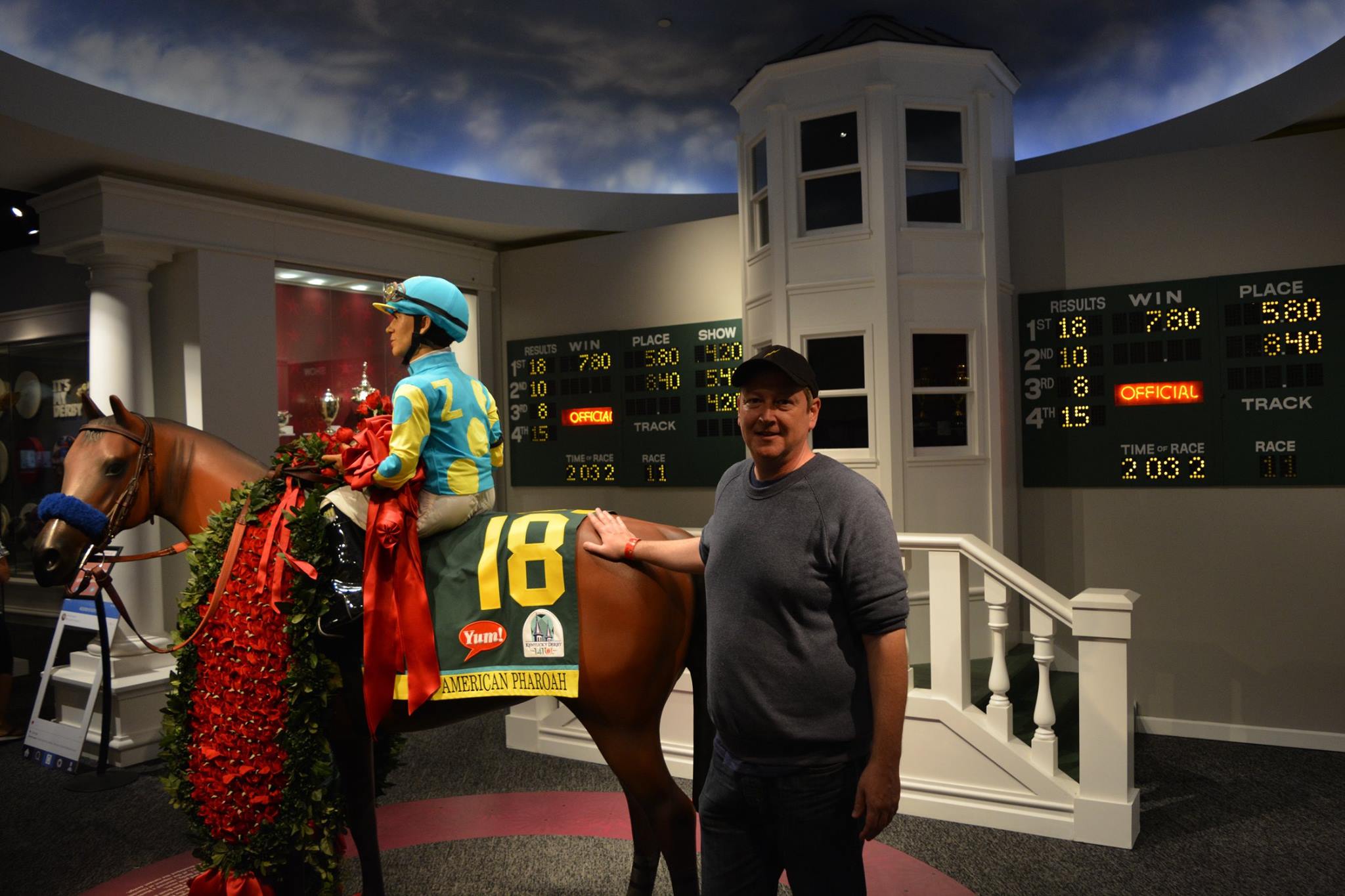 I didn’t plan on posting today but then all this stuff happened: Woke up at 7:30 (a.m.), saw an old school hip hop radio station set up on the Churchill Downs backstretch (Derby first), saw a bunch of fantastic horses (still no Derby pick), crossed paths with a black cat (what does that mean again?), heard from a passing car as I was walking out of the track: ‘watch out for that darkie’ (double take) (I think/hope he was joking about a nearby Churchill Downs security guard that he knew) (Derby first), managed to get a decent amount of work done, visited with some old friends (conversation devolved from Derby to prostate exams since we’re now in our mid-40’s), saw Barbaro (the statue) being ‘groomed’, saw Mormons with a unicycle outside the Derby Museum (definite Derby first), oversaw some infield preparations (everything appears on course), had someone ask me who I thought was going to win (speechless when I realized he was talking about tomorrow’s Indiana primary and not Derby), got my picture taken with a plastic replica of American Pharoah (and returned the favor), saw The Greatest Race movie at the Derby Museum for probably the 100th time (cried…again!), watched replays of some past Derbies I’ve won in the Derby Time Machine room (Derby Week tradition), told probably 15 people that it was my 25th Derby this year (most of them strangers), enjoyed a delicious ice cream concoction named after Secretariat at Comfy Cow just after meeting Kentucky Congressman John Yarmouth and his wife Kathy (who also have not decided on their Derby horse). #JustAnotherDerbyMonday